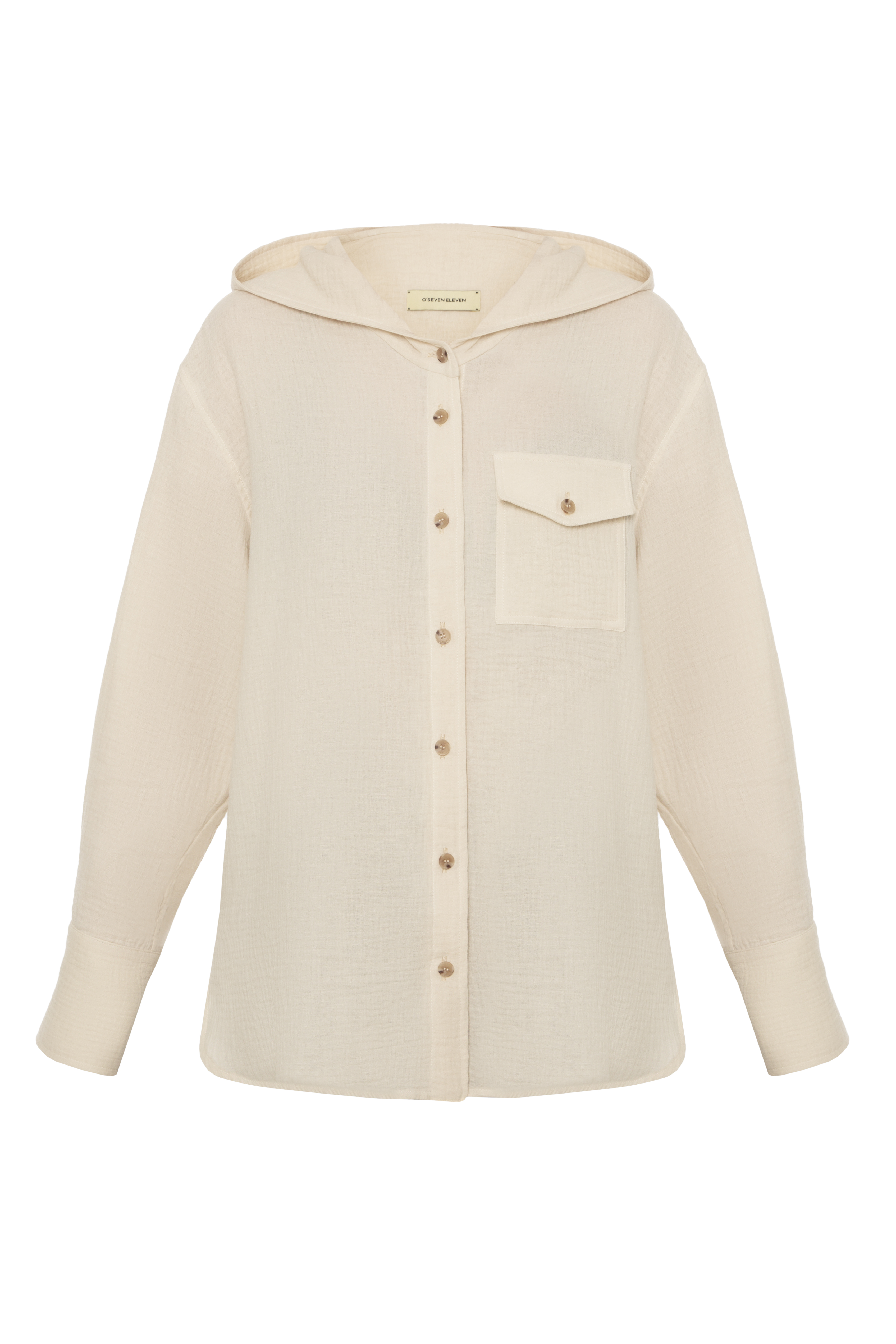 With a hood added, O'SEVEN ELEVEN offers a less predictable option of a classic shirt. Swapping crisp fabrication for a double gauze cotton to enhance tactility, the piece is defined with a front patch pocket and features a long sleeve silhouette and is defined along with a button placket.