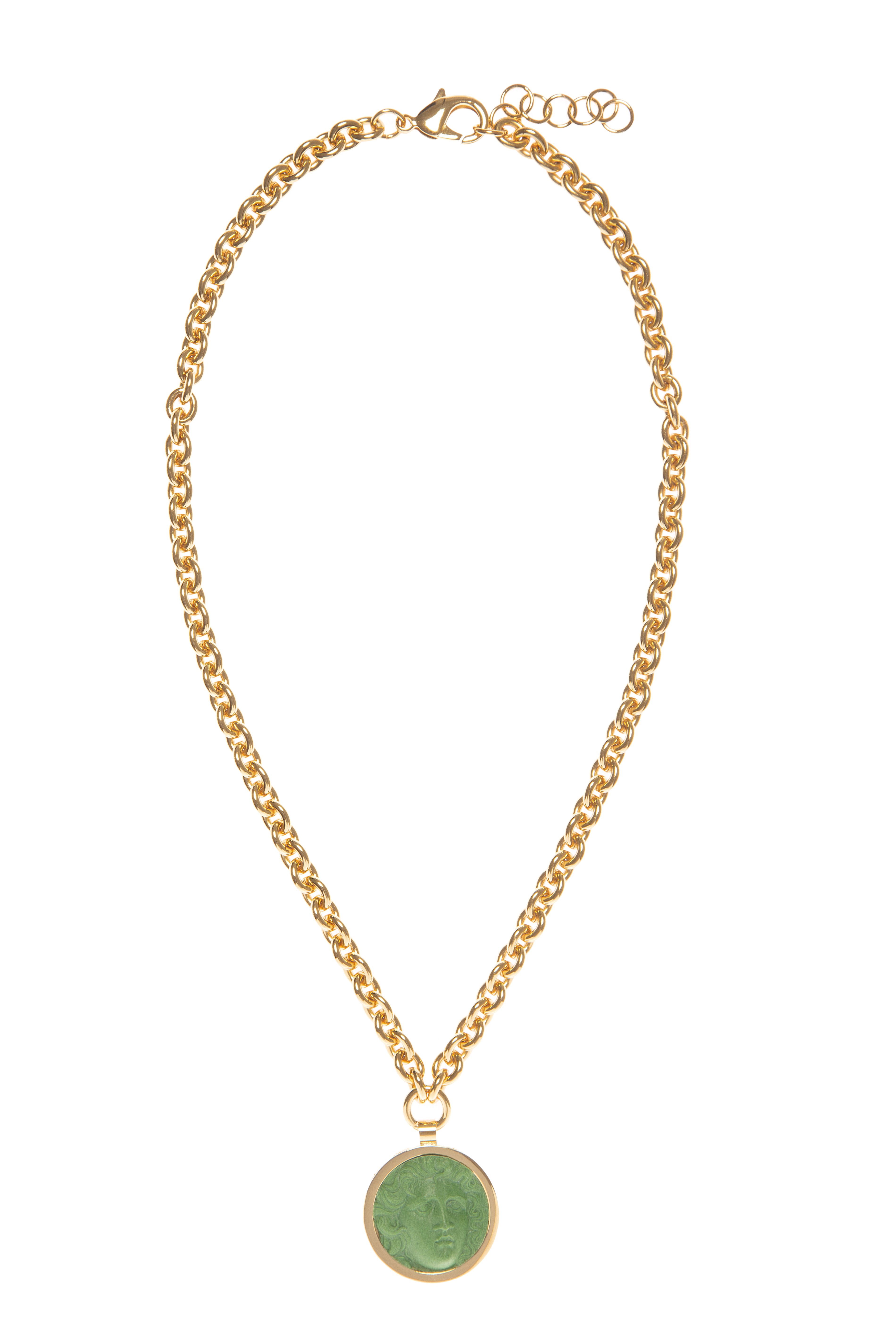 The so-called "Rondanini Medusa". Marble, Roman copy of a 5th-century BC Greek original by Phidias, which was set on the shield of Athena Parthenos. The Munich Glyptothek's Medusa Rondanini is possibly a 5th-century BC work, and the oldest- known "beautiful gorgoneion" sculpture. The design may have been copied from a gilded bronze aegis that once hung in the Acropolis, where it would have been meant to ward off evil and bad luck. A revision of the grotesque, disk-shaped death masks of older gorgoneia, the Medusa Rondanini appears to borrow the idealized likeness of Athena of Velletri, wreathed in decorative snakes and delicate owl wings-Chthonic dread and death mixed with Olympian beauty and cunning. While on display in the Palazzo Rondanini in Rome, it was noticed and first brought to the attention of Northern European art connoisseurs in the 1780s by Johann Wolfgang von Goethe, who wrote, "I would say something about it if everything one could say about such a work were not a waste of breath." Located in the Glyptotheum of Munich.