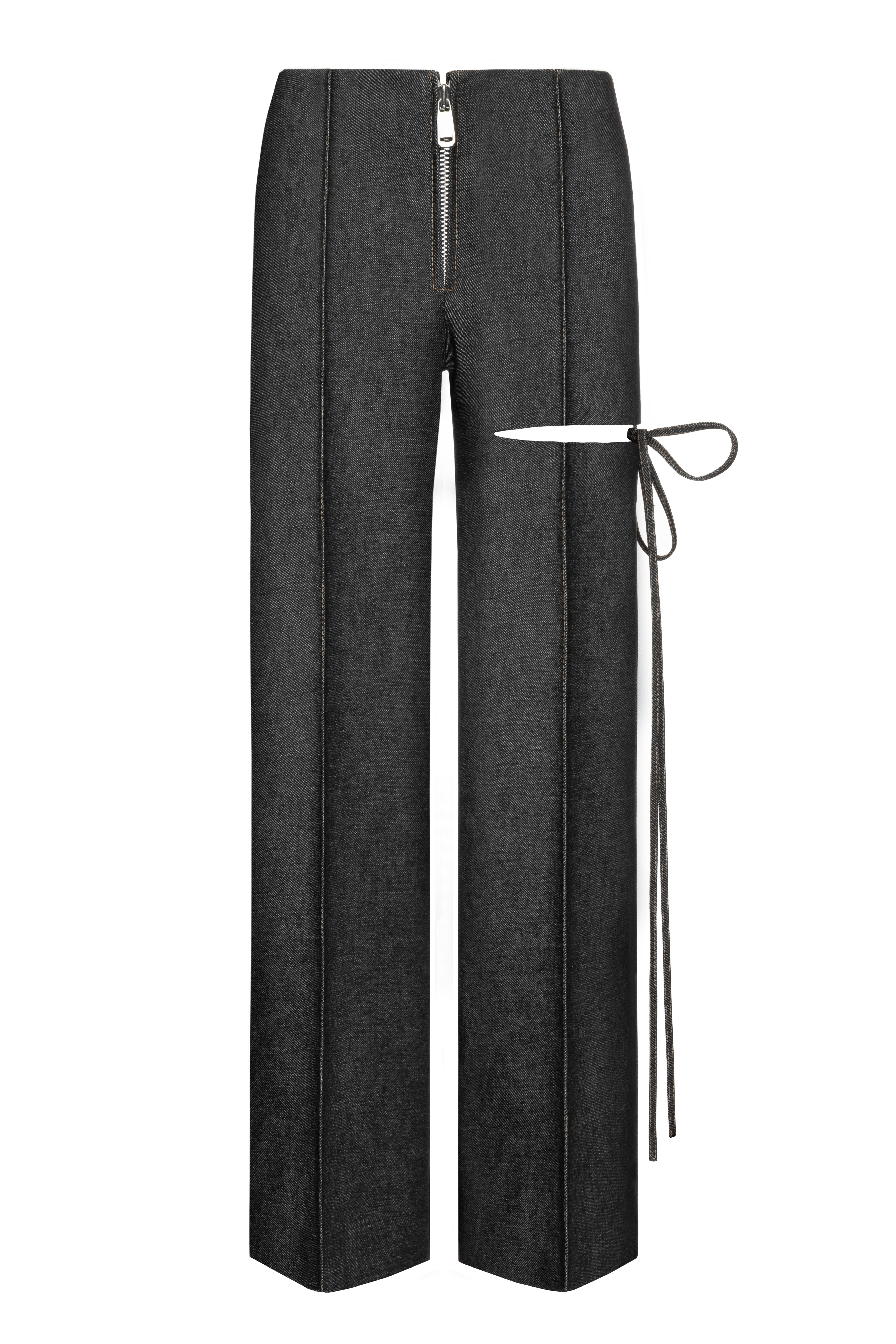 Aleksandre Akhalkatsishvili brings a sculptural twist to classic tailoring with these statement pants. Designed with a slanted cutout on one leg tied with delicate bows, they offer a subtle play on asymmetry and form. The pair features a front zipper fastening and two back pockets, merging sharp construction with the brand’s signature sensual detailing.