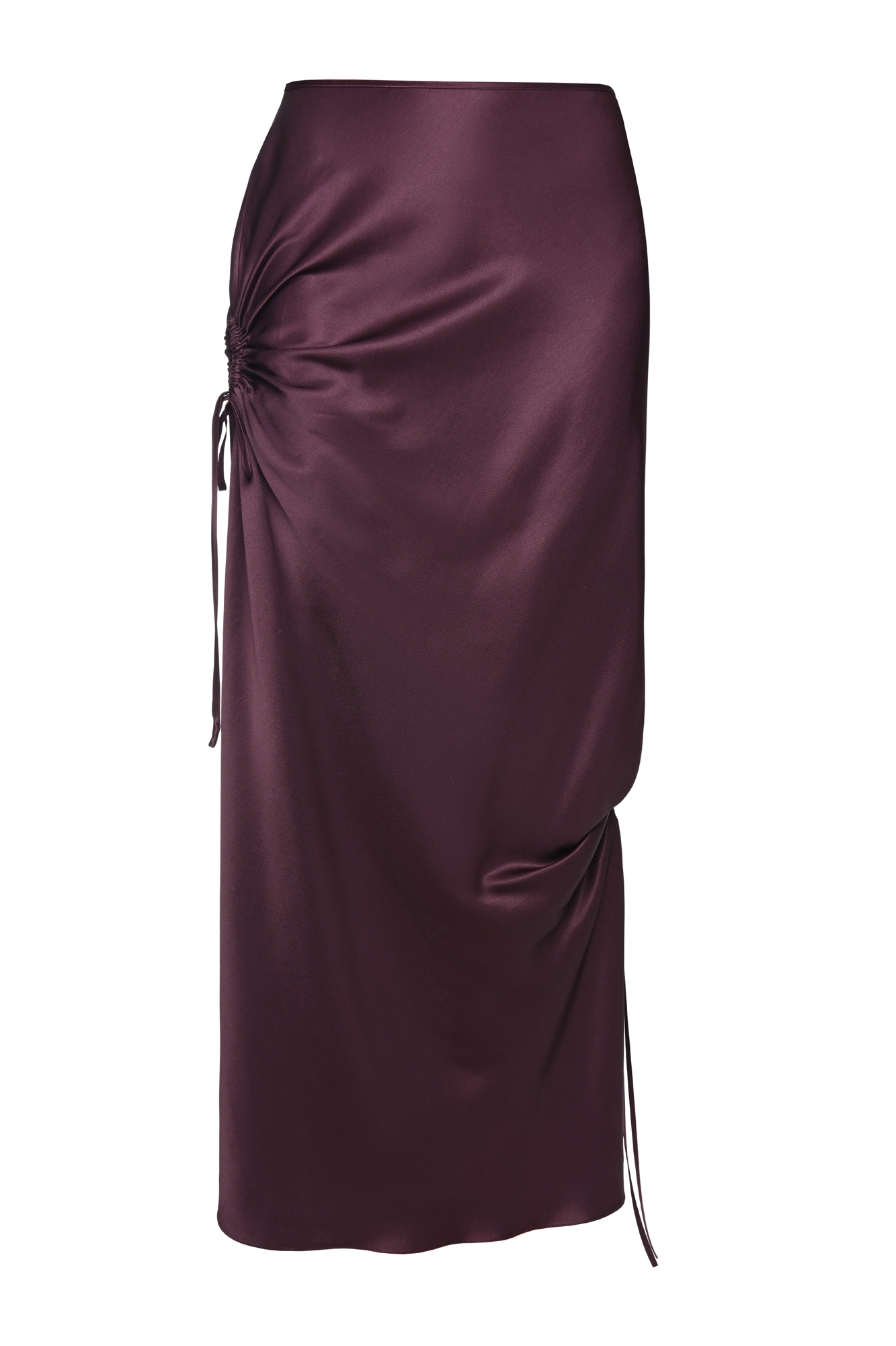 Wine satin midi skirt crafted in fluid satin with cinched circular ruching throughout, creating a softly flared silhouette. Finished with a discreet side zipper for a refined touch.